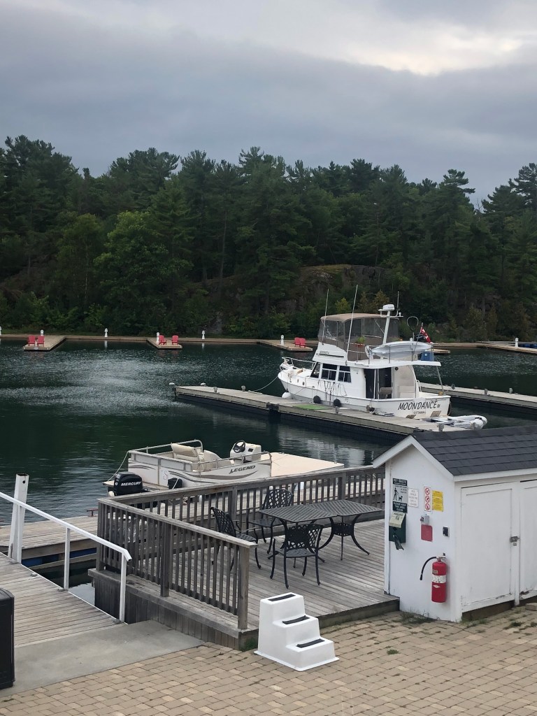 Arrived at 5:30 p.m. yesterday after an eight hour run from Byng Inlet. The dogs were very glad to get ashore. They actually used the pee pad for the first time so they must have been desperate. The place is apparently very busy in the summer. But not right now.