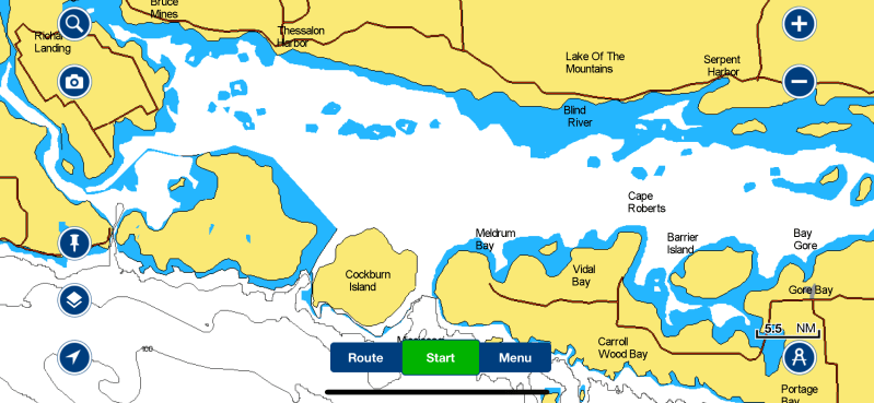 Just around the corner from Meldrum Bay is Mississagi Straits. Between Manitoban Island and Cockburn Island, the strait is an active route for bulk carriers running to and from Thessalon across the North Channel. Sure enough our AIS soon picked up a carrier coming across from Thessalon. Fortunately, we were almost across the strait. The carrier altered course and passed on our starboard side. We didn’t see it but could hear its horn sounding fog signals.