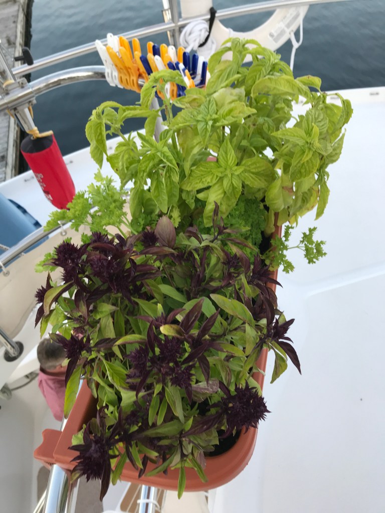 John was chatting with a senior in the boat next door when I got back with the dogs. She was giving him detailed instructions on how to prune our basil to rejuvenate it. Glancing down, I saw she was undergoing a little rejuvenation of her own-joint in hand.