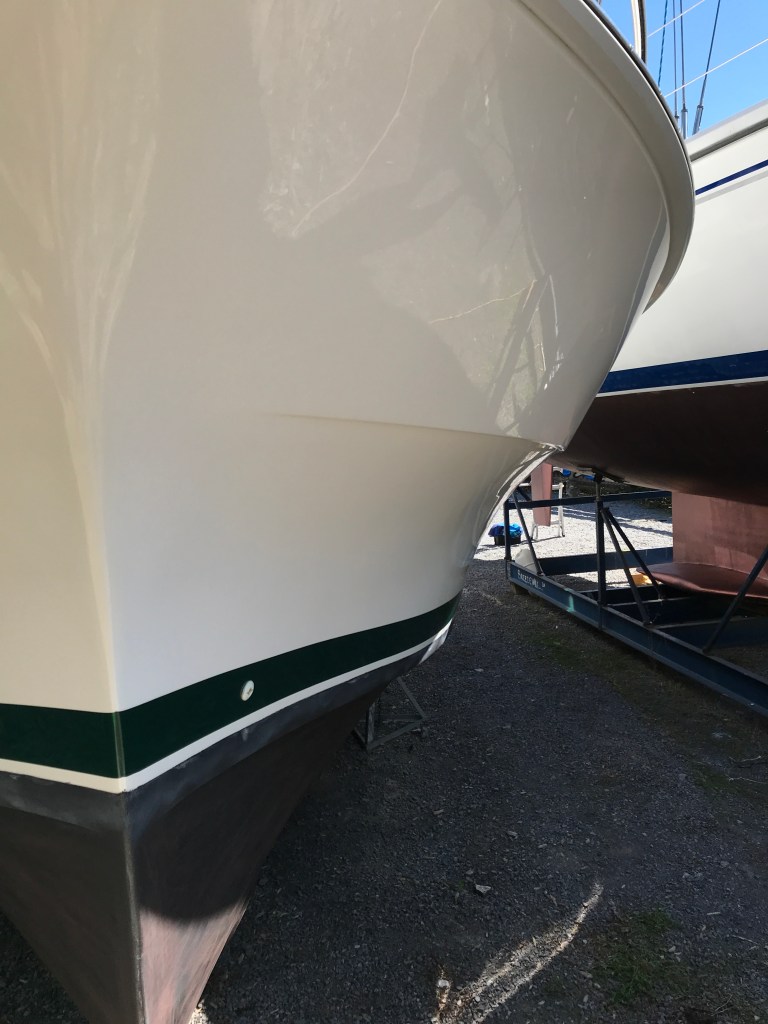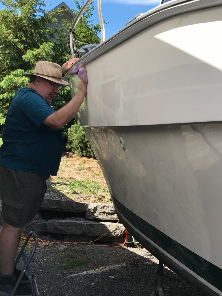 One of the first tasks of the year is to wash and wax the boat. We always start with the hull. Most easily accomplished when the boat is out of the water. And best done early while it is still cool as the large muscle repetitive motion can work up quite a sweat.