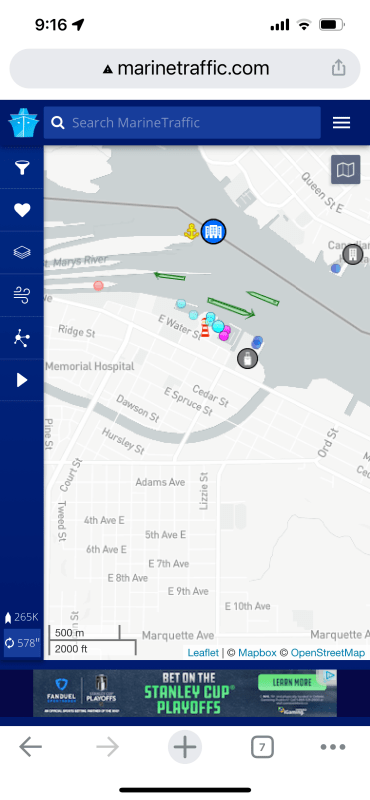 Before we pulled out, we check what we could see in the American locks and also check Marine Traffic – an app that tracks all vessel equipped with ASI. We wanted to know what was unbound that we might meet on the way. The channel just downstream from where we were is one of the narrow spots. The commercial vessel traffic is managed by the port authority as two ships would have issues trying to pass each other.