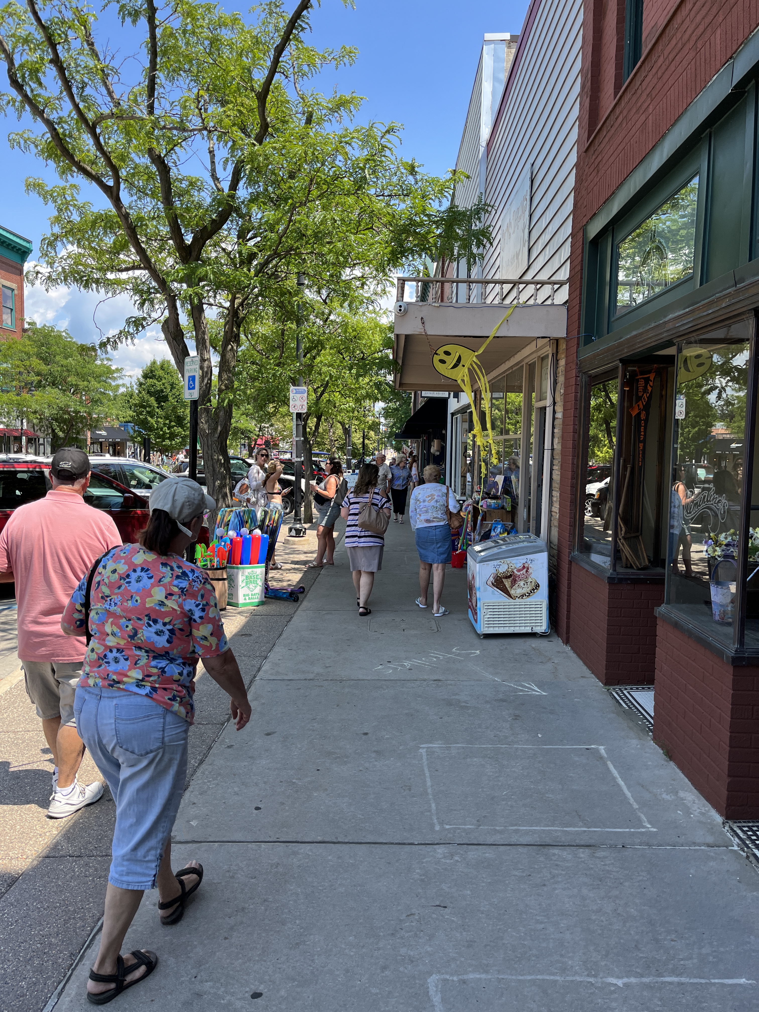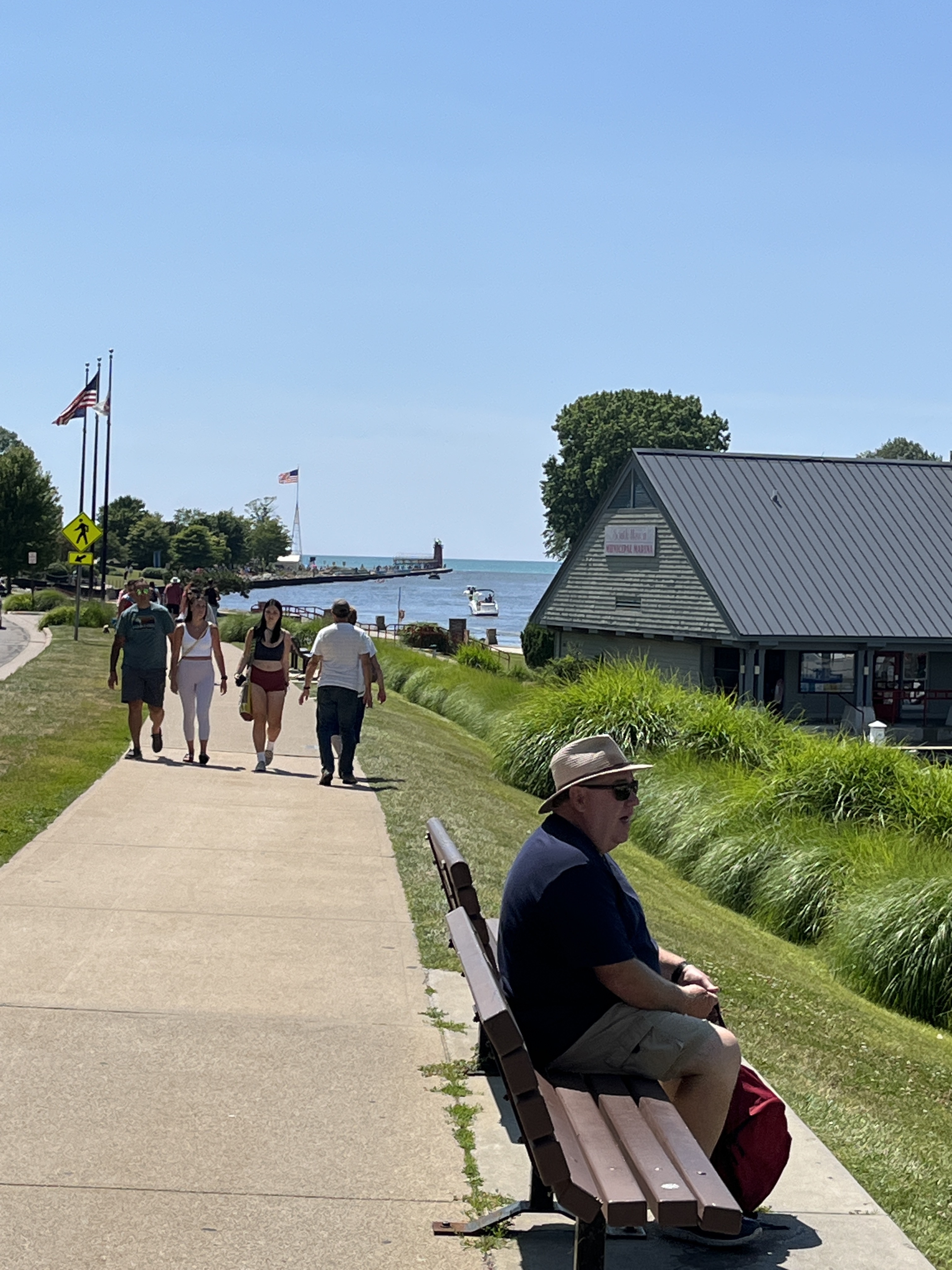 Ottawa Beach Marina in Holland was our first stop in this stretch. Catering mostly to smaller boats, the 40-50 footers are assigned the outside slips. The facilities and staff are great; clean washrooms and showers, nicely kept grounds and a short hike to the beach. Turn right out of the gate and a 1/2 mile walk will take you to general store that stocks a few grocery items but has a wide selection of souvenir type items, great ice cream and a lovely shady deck to eat it on. John borrowed a bike and rode to a marine supply store several miles down the road and picked up the oil filters and wiper blade that he has been looking for since May.