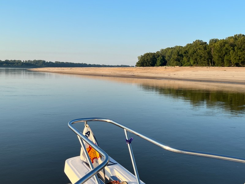 Last night we anchored on a sand bar on the Upper Mississippi River. A gorgeous spot on a sharp bend in the river called Brown’s Bar. We dropped anchor in about six feet of water well outside the channel. The anchor immediately set deeply in the sand bottom and held us fast. The current was strong enough to hold us parallel to the shore even with a light wind and even against wakes from passing tows.