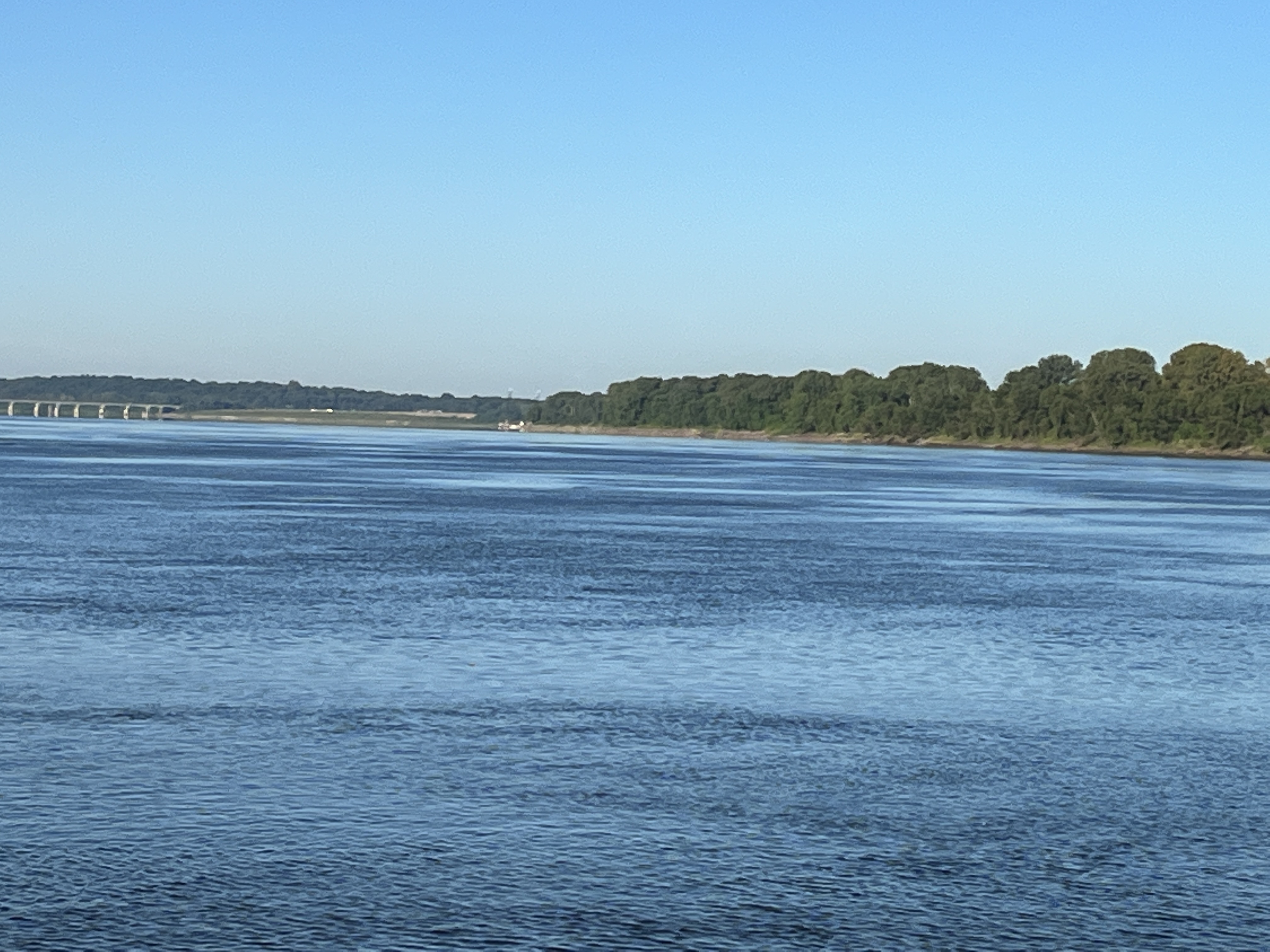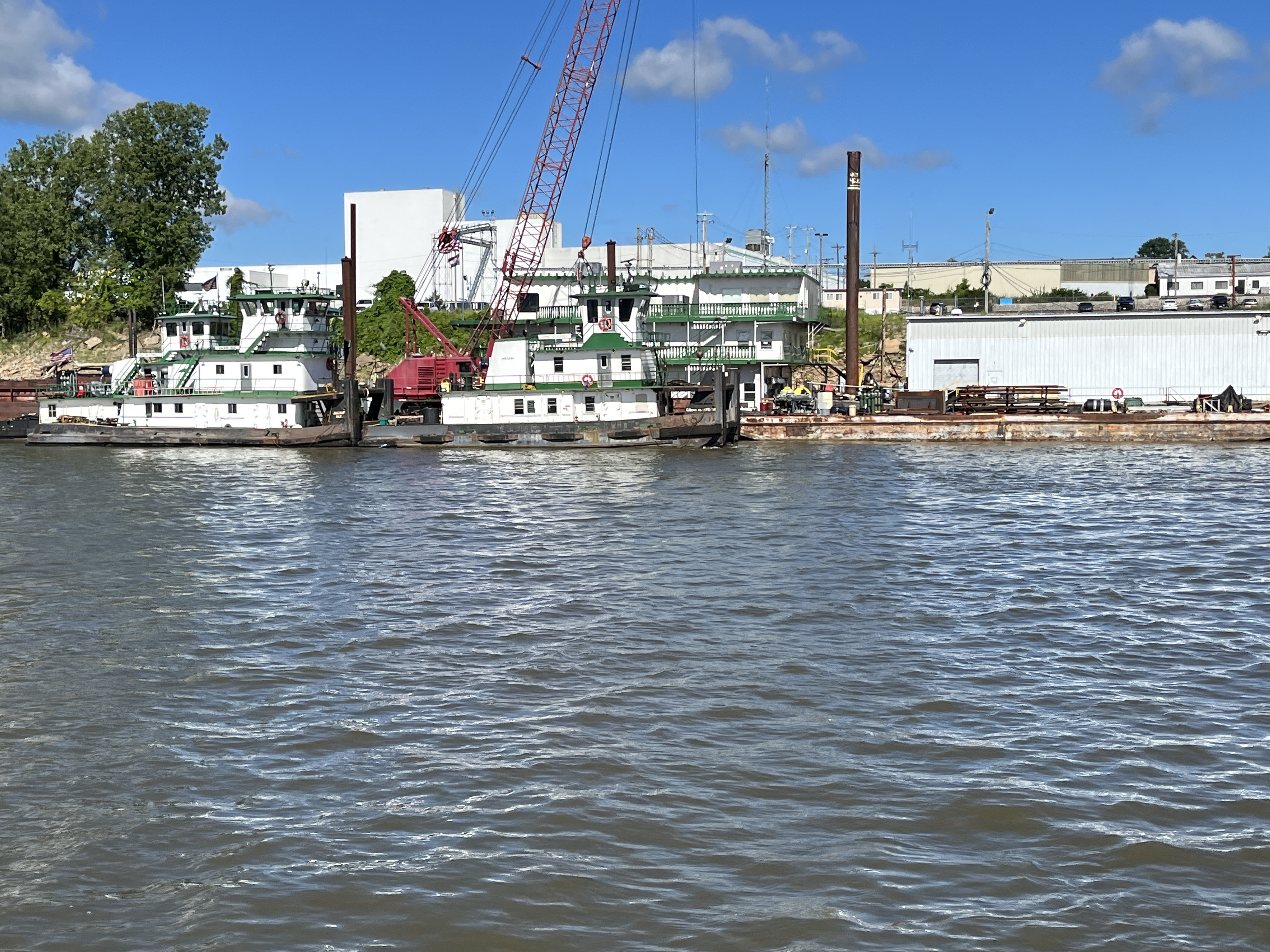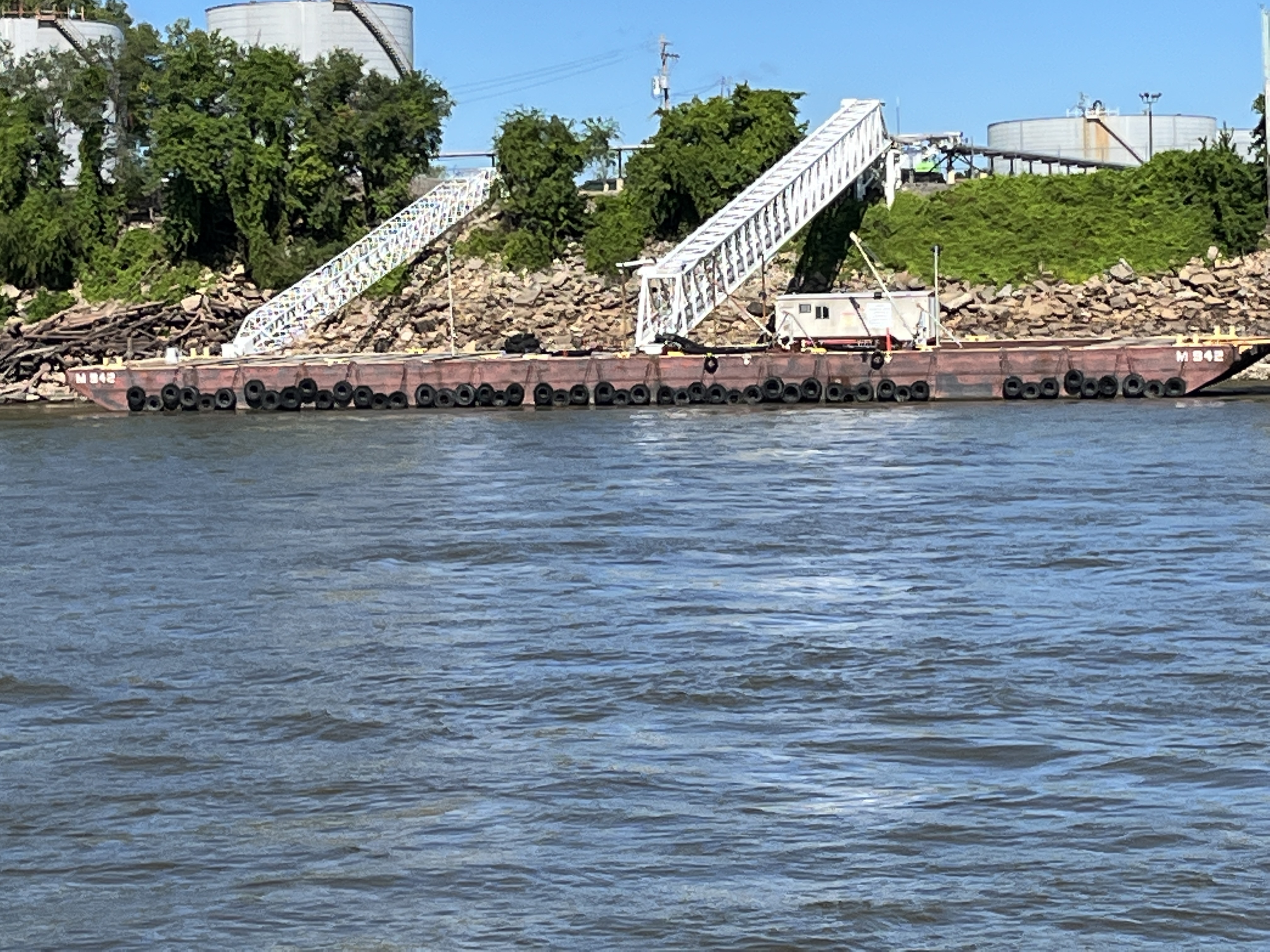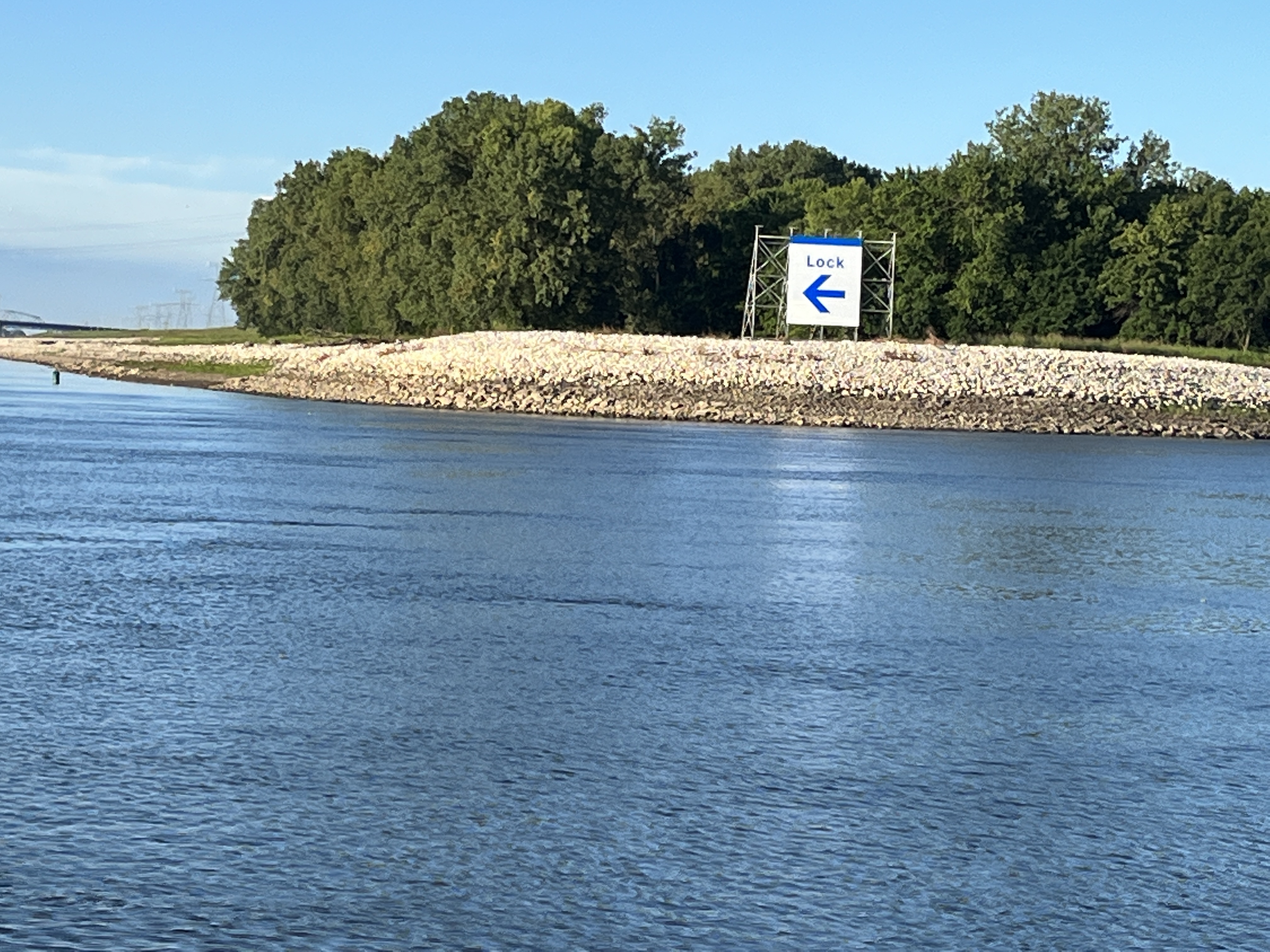 We travelled through with two other boats, Anhinga and Susan Lee. Our timing seemed to be perfect. It was a Sunday – hoping for little traffic, and early. We left Alton at 6:20 when the lock master said “Come on down”. We hustled to Melvine Price Lock just a few miles downstream. Locked through in short order and headed to Lock 27 (AKA Chain of Rocks by loopers).