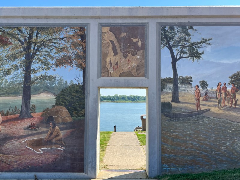 Along Water Street, from Broadway south to Kentucky Avenue, Paducah’s rich and vibrant river history is portrayed in a full block of colorful images, displayed chronologically beginning with the early native Indian heritage to present-day river activities. The location of this particular section was ideally chosen as the River Discovery Center (in the oldest standing building in downtown Paducah) and the Seamen’s Church Institute, Center for Maritime Education are right across the street.