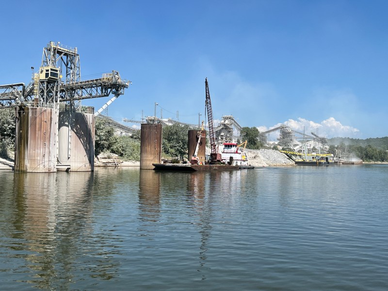 We opted for the Cumberland River route. The queue report shows substantial less traffic, smaller tows and lower wait times. The origin of tows carrying rocks and gravel we had seen previously on the Ohio River, quickly became apparent. At least two large limestone quarry operations are located along the banks of the Cumberland. The river banks nearby are lined with barges waiting to be filled or waiting for a tow to assemble them and push them down river. These are complex operations that permit different grades of aggregate to be moved by conveyor, shovels or in some cases directly dropped from a haul truck.