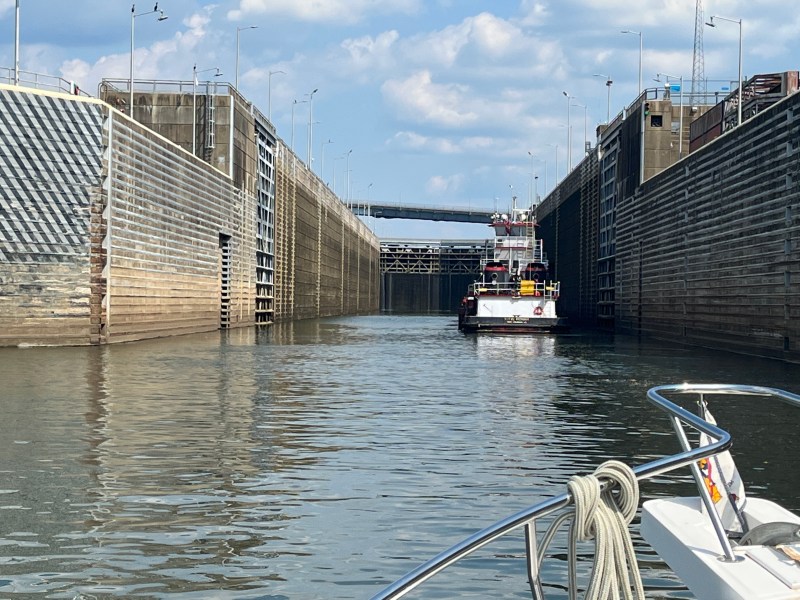 We had one lock to do right at the end of our cruise. As luck would have it, we arrived just behind a tow. Happily the captain was willing to let us join him for the lift. Equally pleasing was the direction from the lock master to tie up on our port side. Perfect! I was shaded by the boat, a welcome benefit now that it was 30 degrees. It also meant I was hidden from the cormorants perching on the light poles on the lock wall.