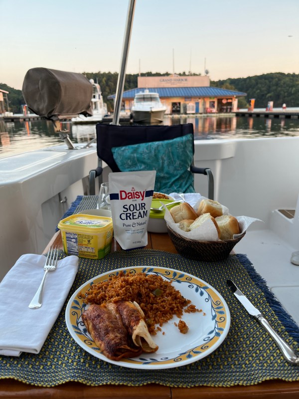 We arrived at our destination, Grand Harbour Marina around 2:30. Topped up the fuel, emptied the holding tank, walked the dogs, had a swim where we crashed a four year-old’s birthday and snagged some chocolate cake. Then leftovers in the cockpit.