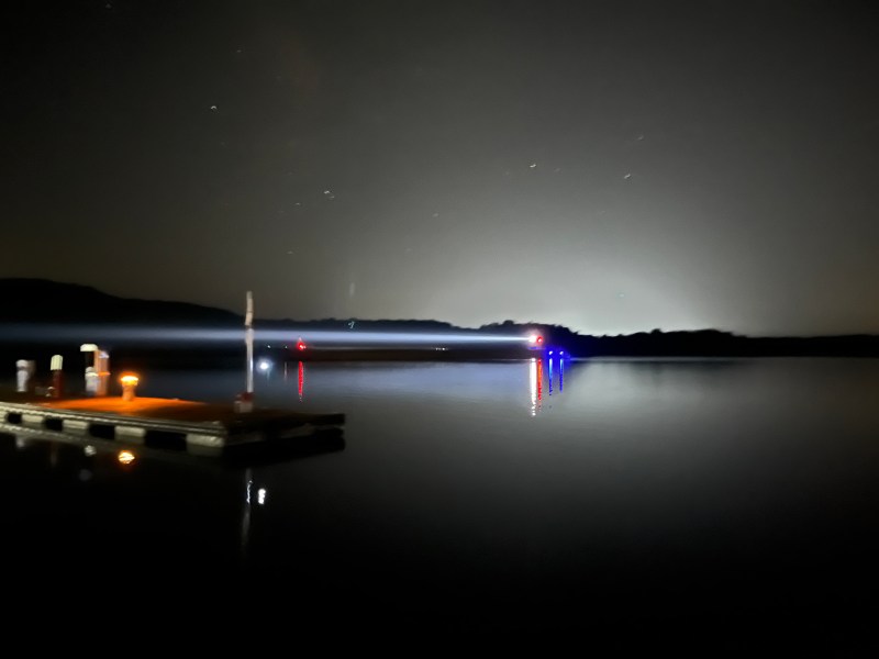 The image below gives a sense of the tows navigation lights. Like Moon Dance they have a green light on the starboard bow, red on the port and an all around white light. Unlike us they carry at least one search light that can light up the shore a half mile away.