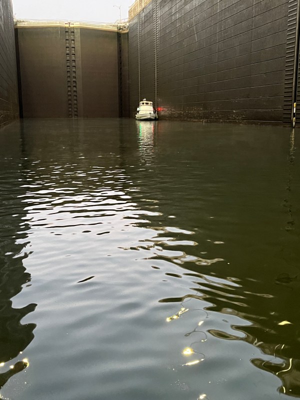 We called the night before to let the lock attendant know there would be two pleasure craft wanting to lock up in the morning. We were told to call at 5:30 and be ready at the lock by 6. Okay, we can set an alarm. Only issue was the lack of light. Sunrise was 6:38 am. At 5:30, it was still pitch black.