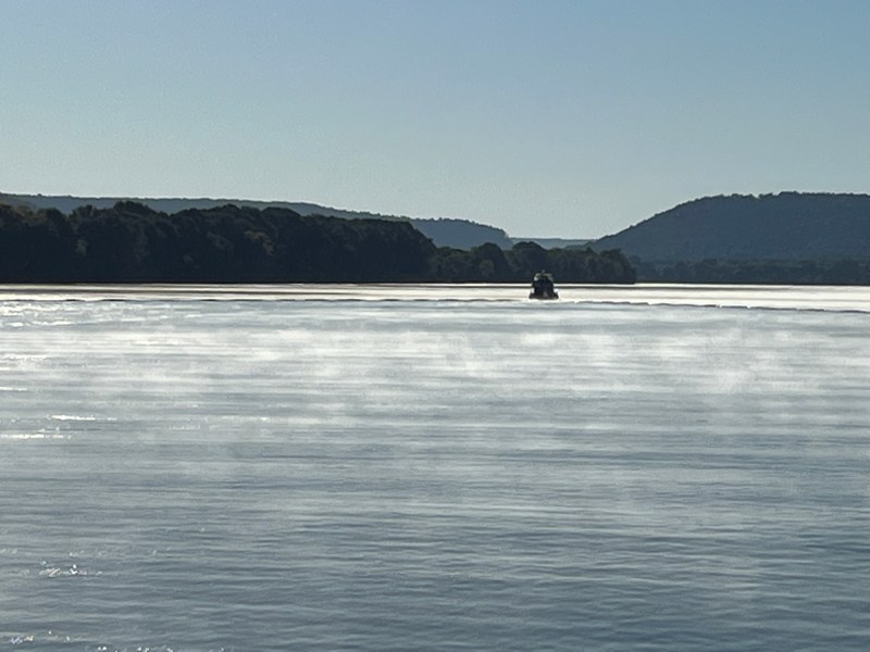 So it was a long three miles to the lock. Fog raising from the river in twisting strands reduced visibility even more. John was driving essentially blind. The only guidance was the chart plotter and one flashlight. The range on the flashlight is a mile so I could light up the sides of the channel and sweep across our path looking for fishing boats or logs. But, at that strength the battery in the flashlight would only last for 15 minutes. Possibly enough time to reach the locks.