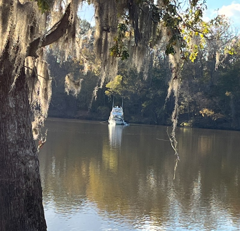 We took the dogs to shore and to stretch our legs. John took this great shot of Moon Dance that was photo bombed by Spanish Moss. We are getting closer!