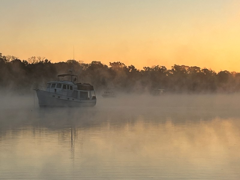 Coffee, cinnamon rolls and fruit in the salon with the generator thumping away to heat the boat. Frost on the deck still hadn’t melted by the time the sun was high enough to see through the fog.