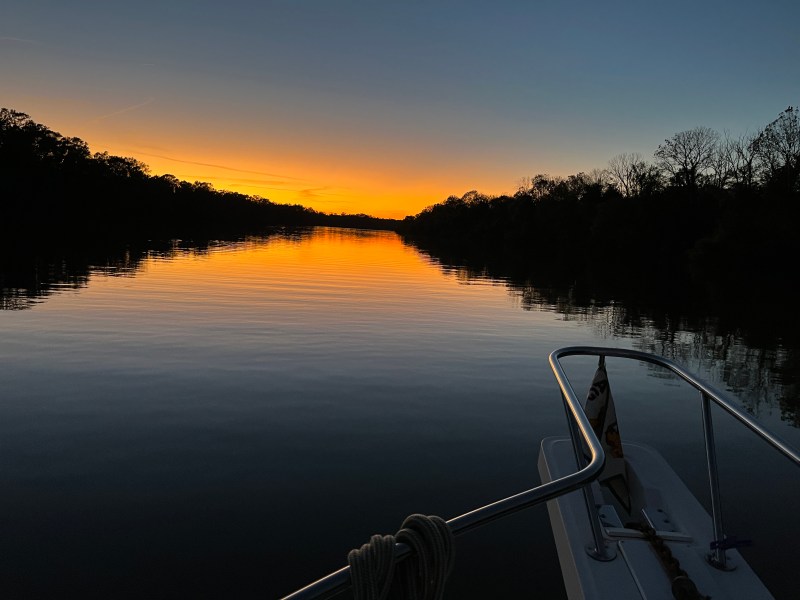 Some reviews said this anchorage has a place to get dogs to shore. However, the only suitable place was a boat ramp 2 kilometres upriver. Given our dinghy’s top speed of 8 kilometres an hour, the lateness of the hour, and a temperature of 2 degrees, we decided that the dogs would have to use the astro-turf on the bow.