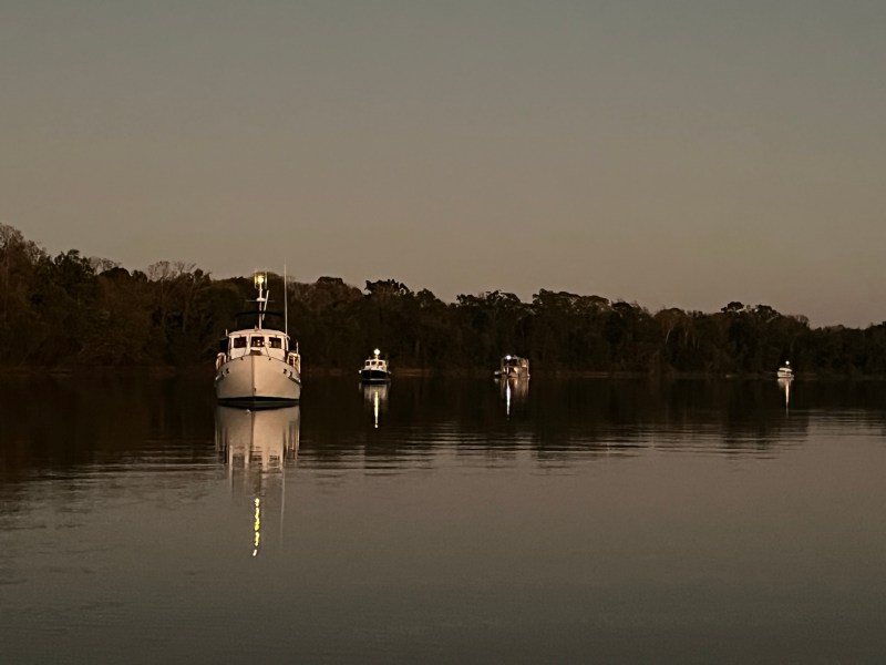 Another beautiful spot to anchor. The Tensaw river splits off from the Mobile River. There is no tow traffic and the Tensaw channel bends away from the Mobile so the shore acts like a breakwater. Wakes from tows passing by won’t disturb our sleep. Also, the current flow will keep us straight without a stern anchor.