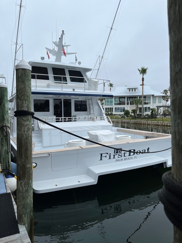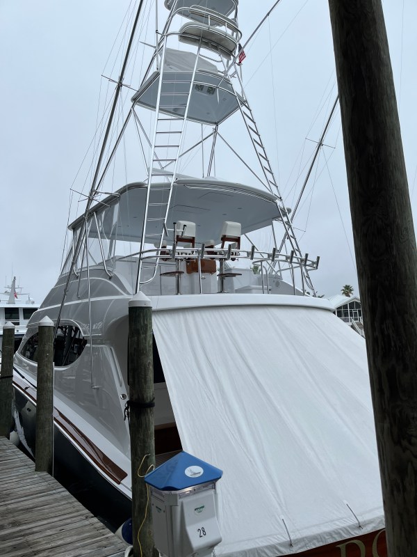 Here is the boat slipped behind up. It was imported from Australia and is 26′ x 85′. The captain and first mate live aboard. The owner uses it for red snapper fishing. He has two other boats. This is the mid-sized in the fleet. The boat is normally in West Palm Beach at this time of the year. But a new management company overlooked paying the slip fees for the three boats and lost them. There is at least a 10 year waiting list to get back in the marina there. The owner is 80 so we suspect there is a lawsuit brewing if not already before the courts.