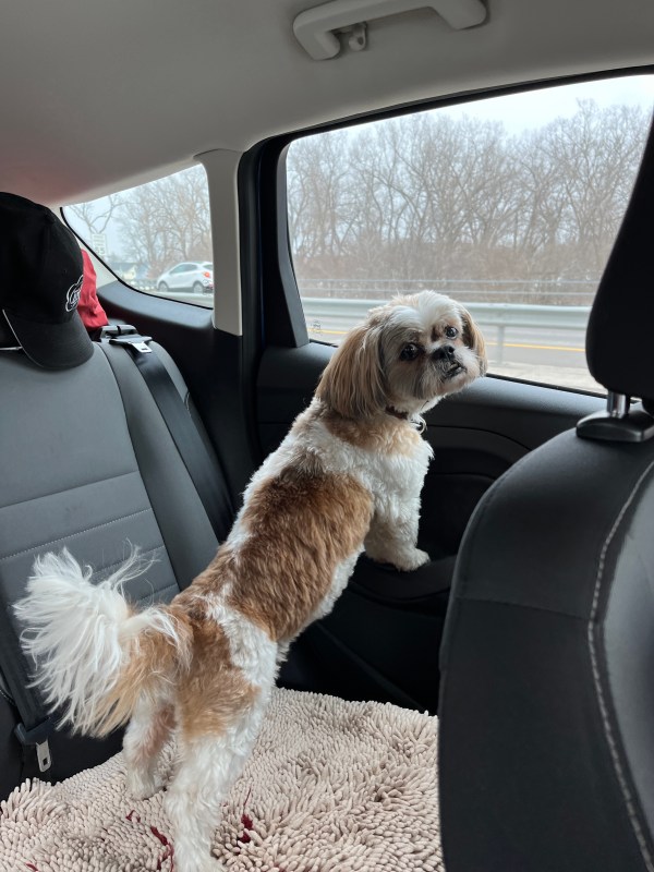 A little further along, even Maggie was surprised at the lack of snow in Buffalo. It is hard to believe the thruway was closed last week because of a storm. But it is all gone now. Also, I think she just realized we have another two days in the car. If they were a little smaller, they could fly cabin. Oh well!