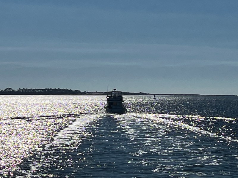 From Fort Walton to Panama City is 70 miles or so. Too long a day for us. An anchorage named Fluffy Landing near the Choctawhatchee Bay Bridge looked interesting but across the bay was another anchorage near a boat launch where we could get the dogs to shore. Plus, there was a causeway half way the bay under the bridge that would block winds from just about any direction.