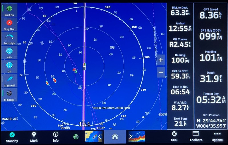 Ourselves and 3 other boats made arrangements to leave together. The picture below is of our radar screen, you can see the image of the other three boats astern of us and to port (behind on the left).