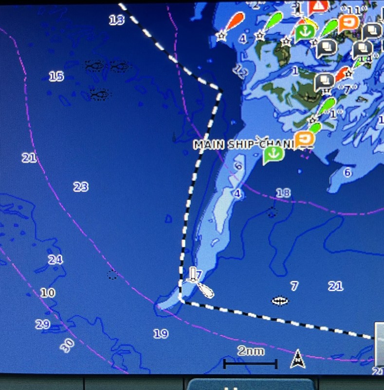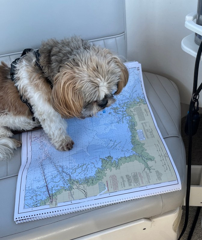 Whose fault was this? Well I’ll tell you, it was Maggie’s fault. She has been begging for weeks to drive the boat. “I am so bored” she said. “You never let me do anything fun” she said. I said you can’t drive the boat, you have no thumbs. She huffed and said fine, at least let me navigate. Linda said let her try, what’s the worst that can happen. So I told her to study the charts and make up a course. So, she consulted the charts and plotted a course.