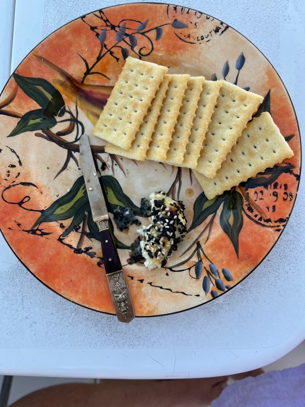 We are ensconced in the cockpit sipping drinks and snacking on sesame-crusted feta drizzled with thyme honey from Crete. Life does not suck.