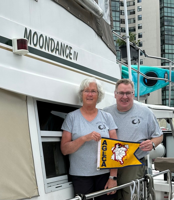 That gold flag will look mighty good on Moon Dance! We so much enjoyed meeting you in Peoria, sharing food/beverages and good conversation along the way on the Tennessee, and having anchoring fun together in Florida. I wish we would have caught up with you again before you went all gold on us! But I have a funny feeling we’ll see you again someday. Love and congratulations from your friends on Surface Interval!!