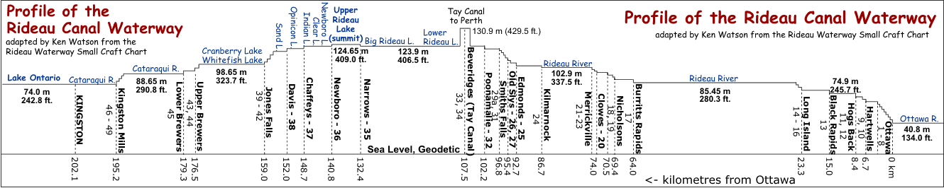 About 50 dams were necessary to control the water levels at rapids on the Rideau and Cataraqui rivers. The 46 (originally 49) locks in use raise vessels 83 m from the Ottawa River to the portage channel at Newboro, whence vessels descend 50 m to Lake Ontario at Kingston.